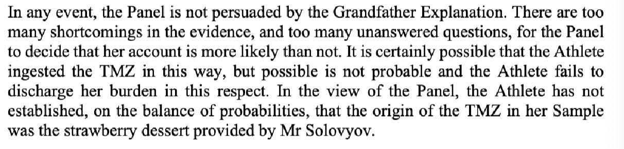 In order for the CAS panel to decide what consequences Valieva should face, they needed to decide whether Valieva took TMZ intentionally. But it was difficult for the panel to decide intentionality without evidence as to how TMZ ended up in her system. That’s why they focused so much on the Grandfather Explanation.
