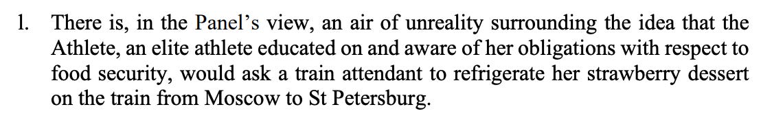 “It is ‘inherently implausible’ that an athlete at this elite level would take a homemade strawberry dessert with her across Russia and eat it during a competition period.”